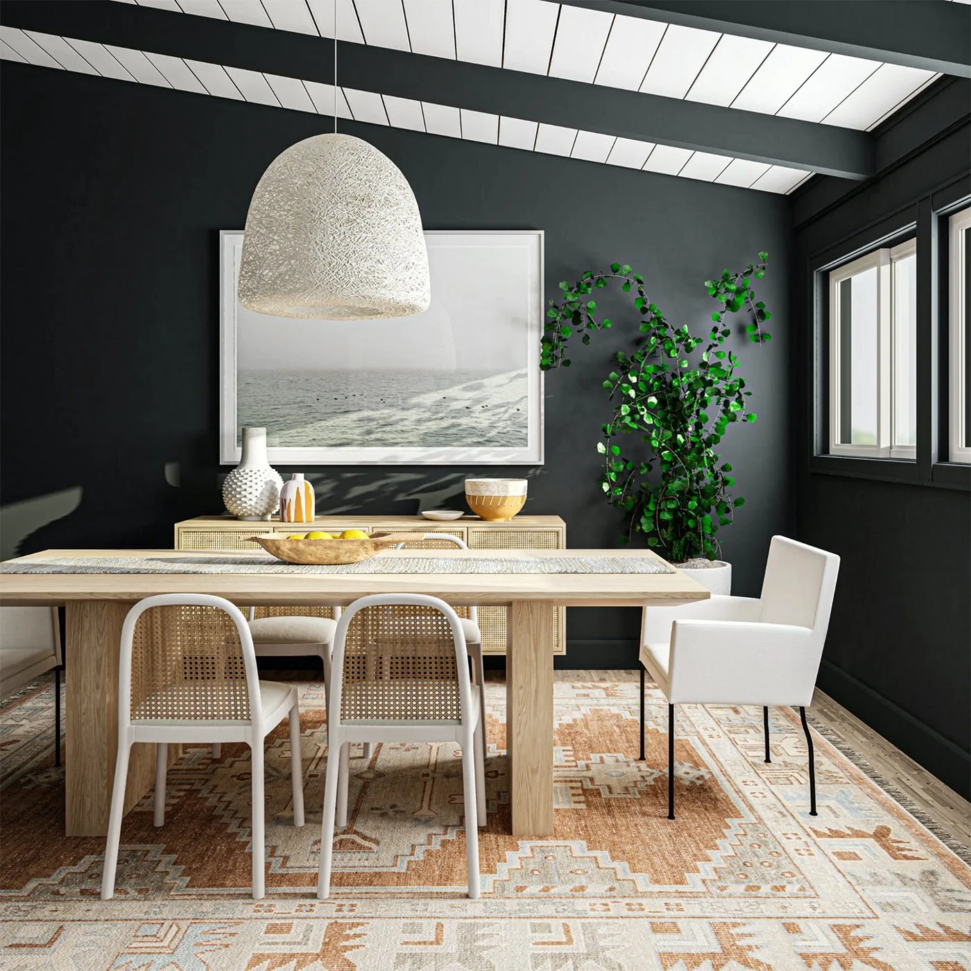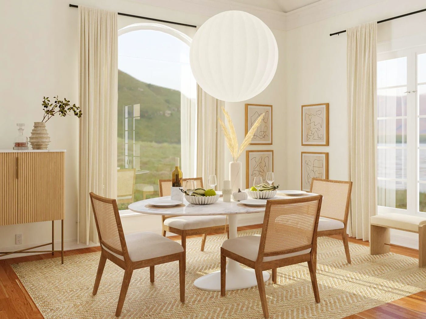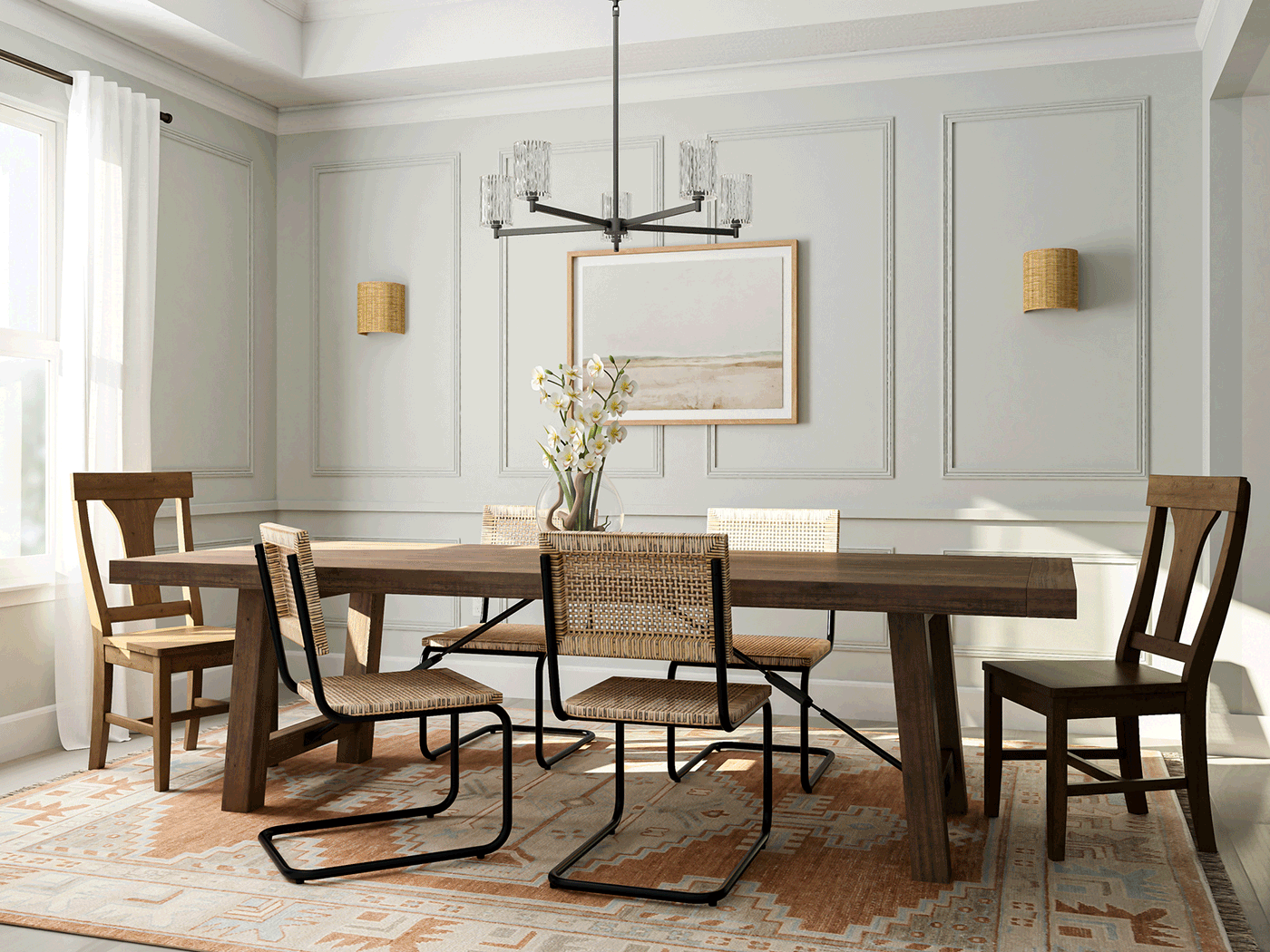 For example, a wood table with cane chairs will feel cohesive and add a pop of visual contrast, because both materials are natural and have a similar vibe. Meanwhile, a marble table with chane chairs (as in the dining room above) will bring a bit more contrast and create a bolder statement in your space.