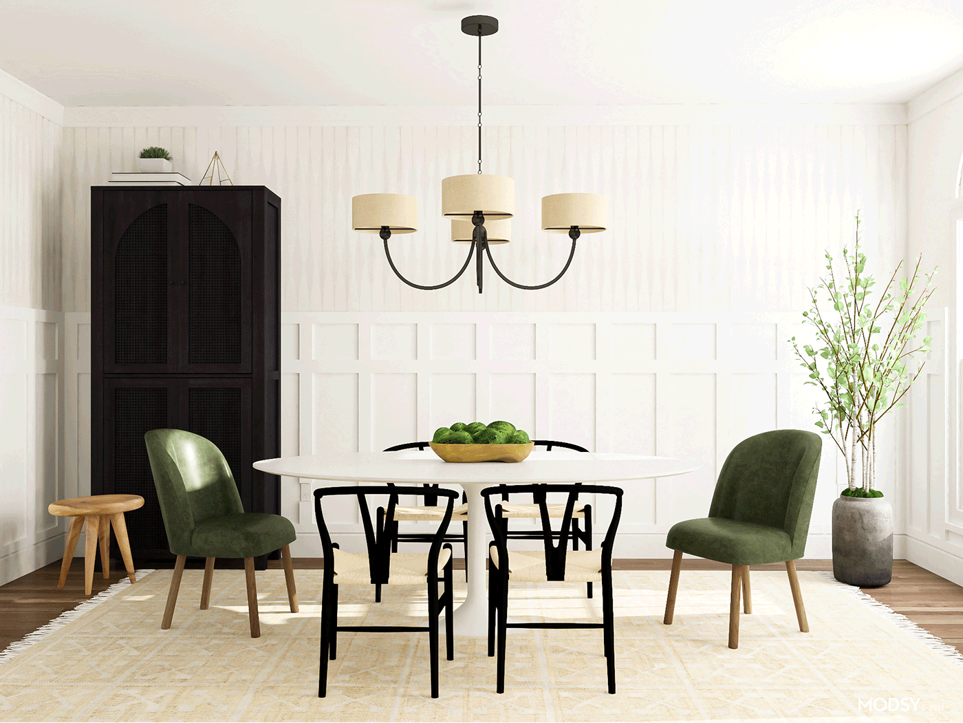 What does this have to do with your dining room? Well, if you have a visually heavy table, you’re going to want to balance it out with “lighter” chairs—and vice-versa! For example, if your table has skinny metal legs and a glass top, you’ll want to avoid chairs that are also clear or have tall slender legs because the overall arrangement will feel unbalanced and too light. Instead, balance it out with a lighter table with more solid-looking, visually heavier chairs. Or consider the dining room pictured above. When you have a substantial pedestal dining table like this one, it has a lot of visual weight. To balance this, pair it with chairs that feel airy and light, like these white chairs with slender legs and cane backs.