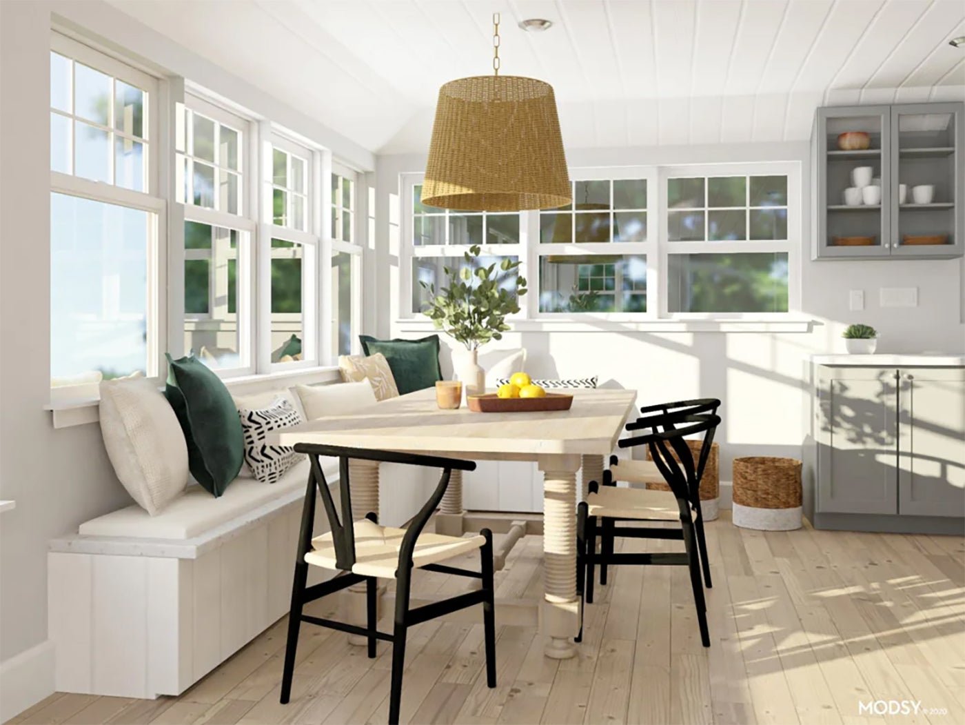 Instead, break up all the sameness with different colors. This is an easy way to ensure your room feels curated but still layered and interesting. Just look at the dining nook above: the dining table is a light pine, and the black frame of the chairs adds contrast to the arrangement. And, while the chair’s seats are a similar tone as the wood of the table, they’re a different material, which helps add texture and depth. (More on that, below!)