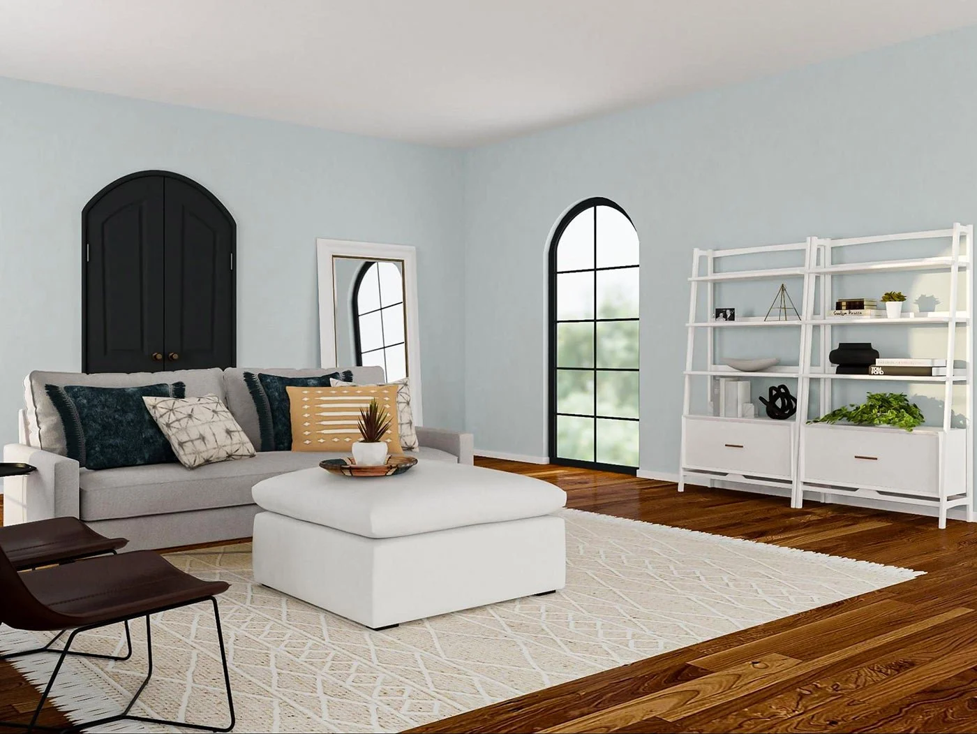 Crisp, light blue paint is a soothing balm to balance out the sometimes-aggressive nature of cherry hardwood floors. Light blues help visually diffuse the red tones in your flooring and lighten up the room.