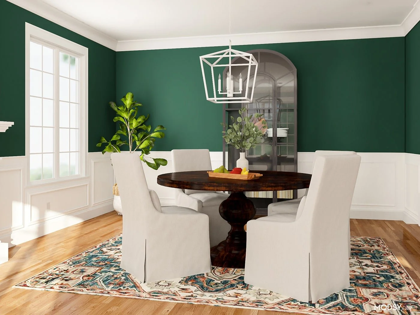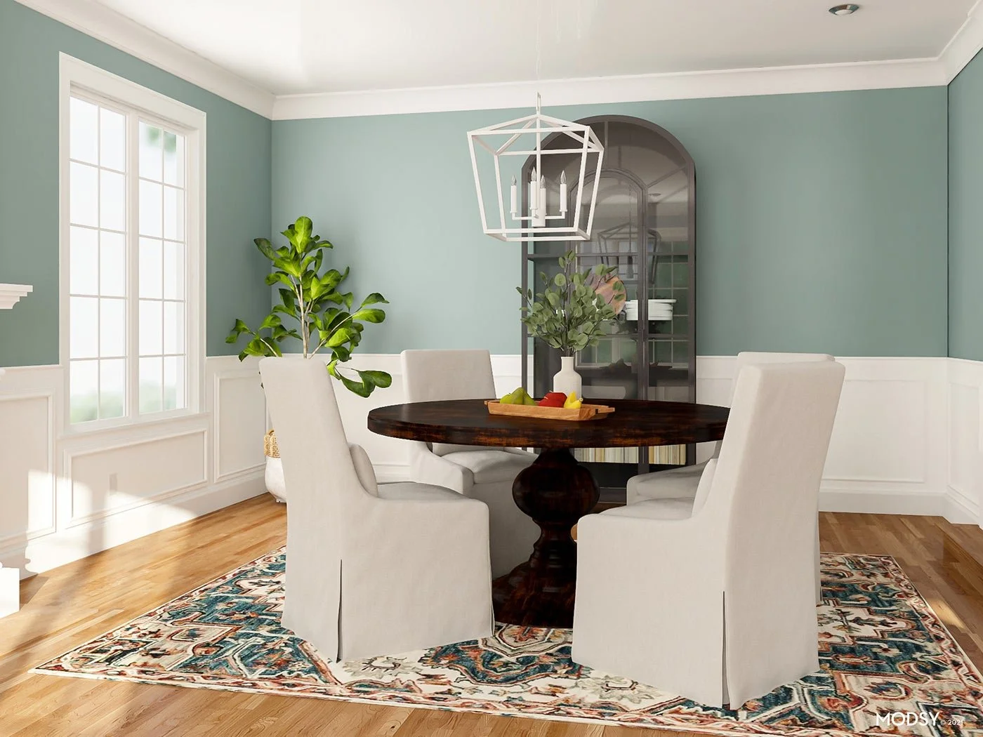 If dark, bold colors aren’t your thing, try a lighter shade of blue instead! Light, cool blues offer the same effect as an emerald green, balancing out the warmth in your floors, without feeling as bold. And if you simply prefer neutral tones over colors, go for a cool gray or white (like the color pictured above, on the wainscoting).