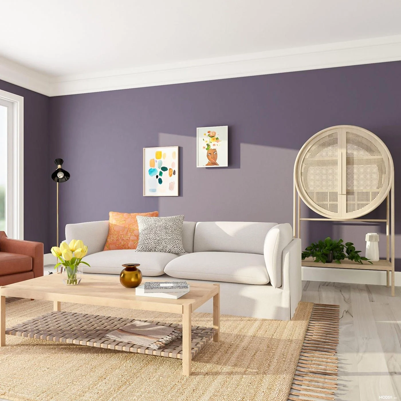 If you want more contrast and a more saturated color, opt for a deep, bold color with a warm tone—like plum! This shade of purple balances out the steeliness of the floors. And since purple has red undertones in it, it inherently adds a bit of warmth to the space.