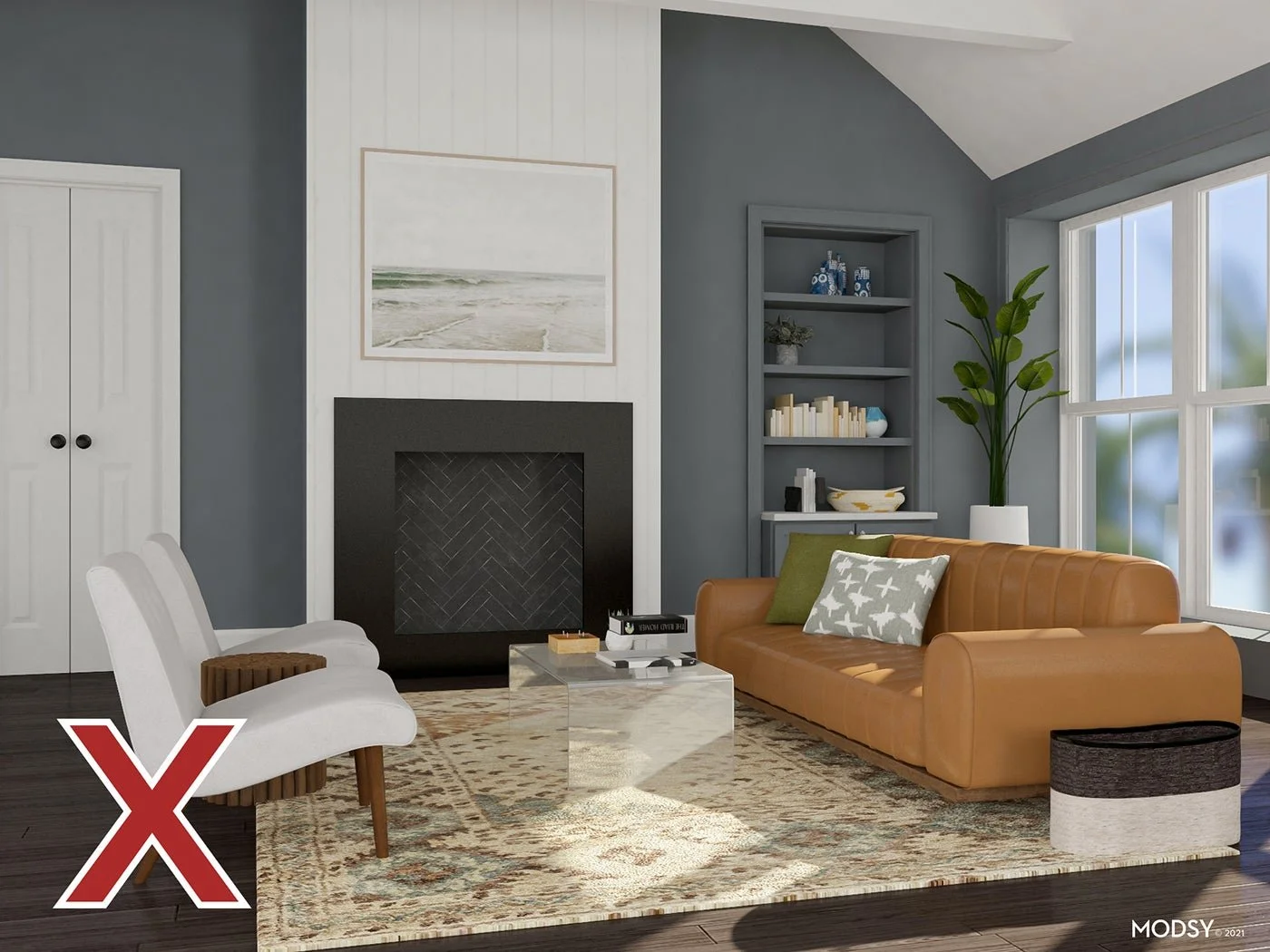 If you prefer neutrals to colors, go for a gray or white paint that has a cool undertone. This is a more subtle choice than the blue paint, but it will still help to balance out the red floors.