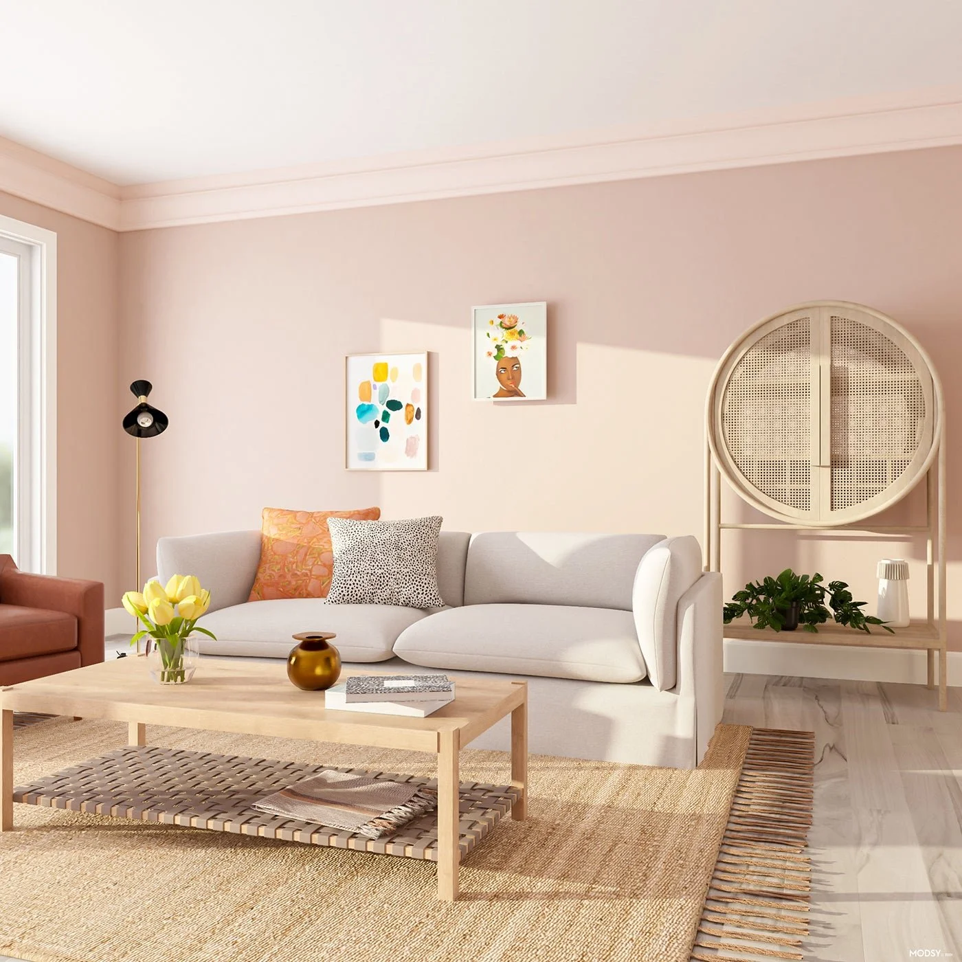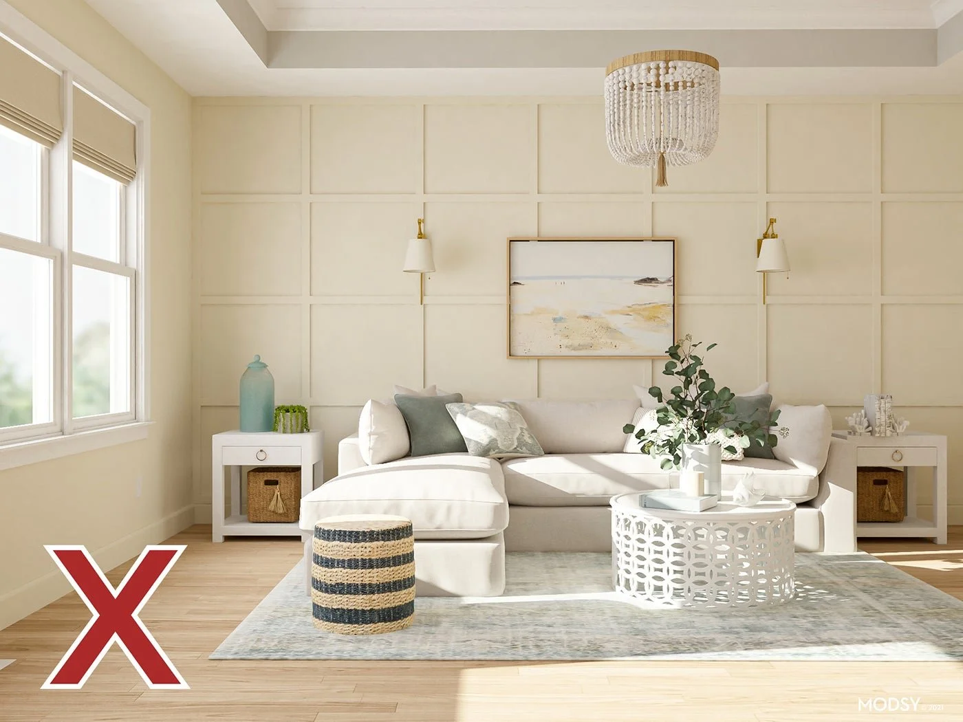Since the wood floors are a warm neutral, you want to stay away from warm neutrals on your walls. A tan or creamy paint color that’s too similar to the flooring hue simply doesn’t work well with light hardwood floors; as you can see above, the result is a visually flat space. And the slightly yellow undertones, though subtle, will alter the vibe of the space and lend a sallow look to the pallette.