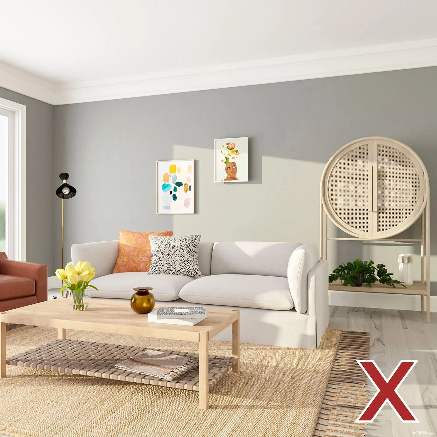When it comes to gray flooring, steer clear of a monochrome look. (We don’t want to see any interior design equivalents of the #groufit, people!) Matching the cool gray of the floors in your wall color will result in a space that feels cold and sterile. Not only that, but the overall design falls flat and feels rather one-note.
