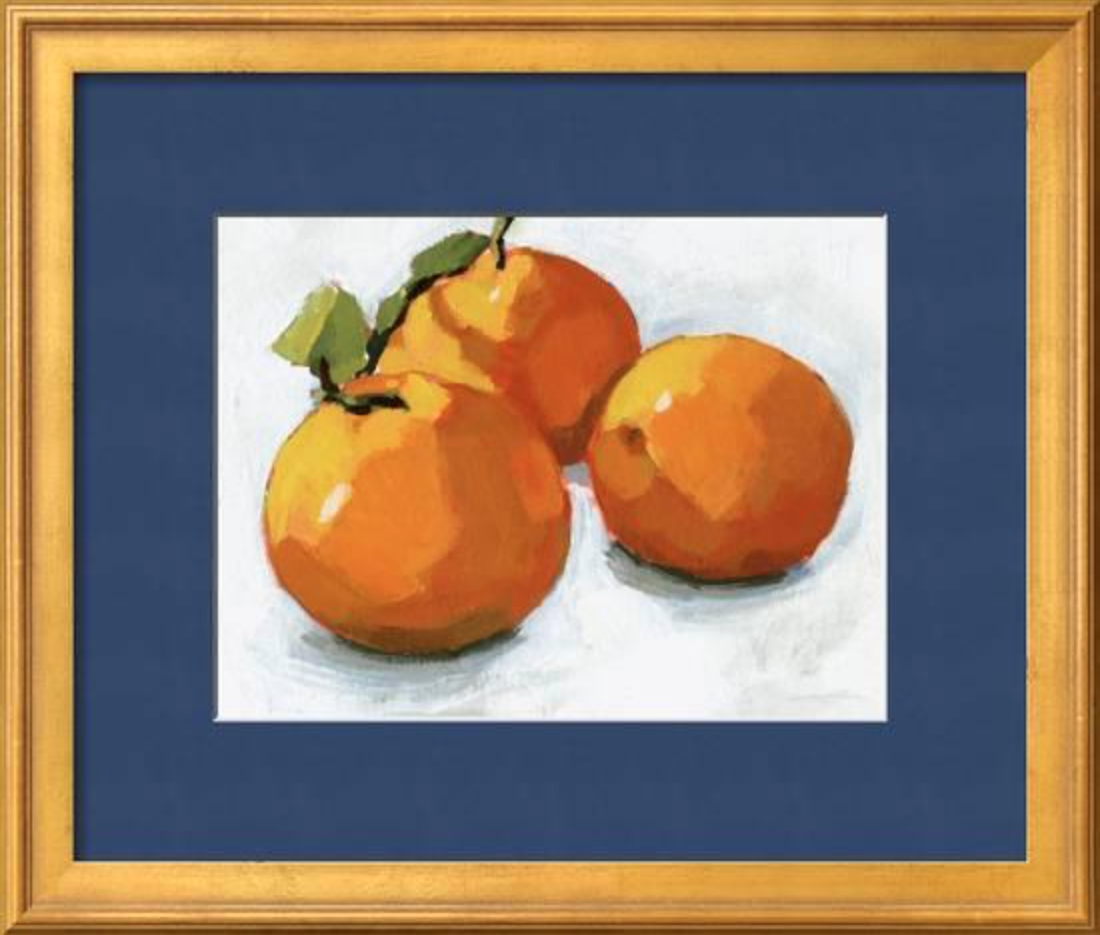 And if that’s not enough for ya, go full-out with a colorful mat! This is a little more daring, so choose wisely as you can’t really swap out a mat later. I love this for simple compositions like the above trio of oranges. I chose this navy blue mat (note that blue is the complementary color to orange), which highlights the darker shadows in the piece and brings it to life in a way that simple white couldn’t.