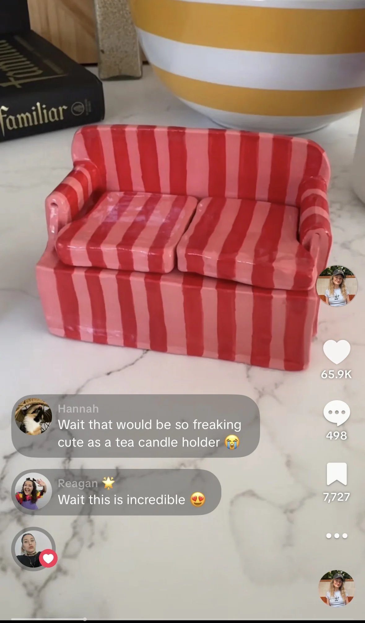Prototyping! Viral video showing a new ceramic mini sofa trinket dish I was prototyping.