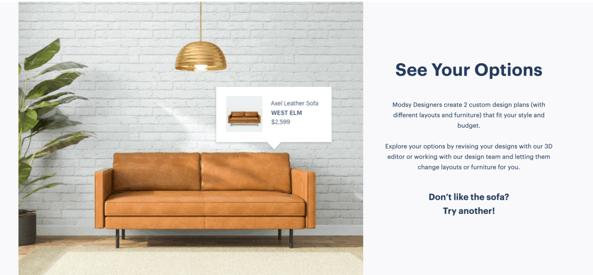 This module also helped to reinforce the points around real furniture (here we showcased a sampling of sofas from popular brands) and teased at the UI of the Modsy design experience.