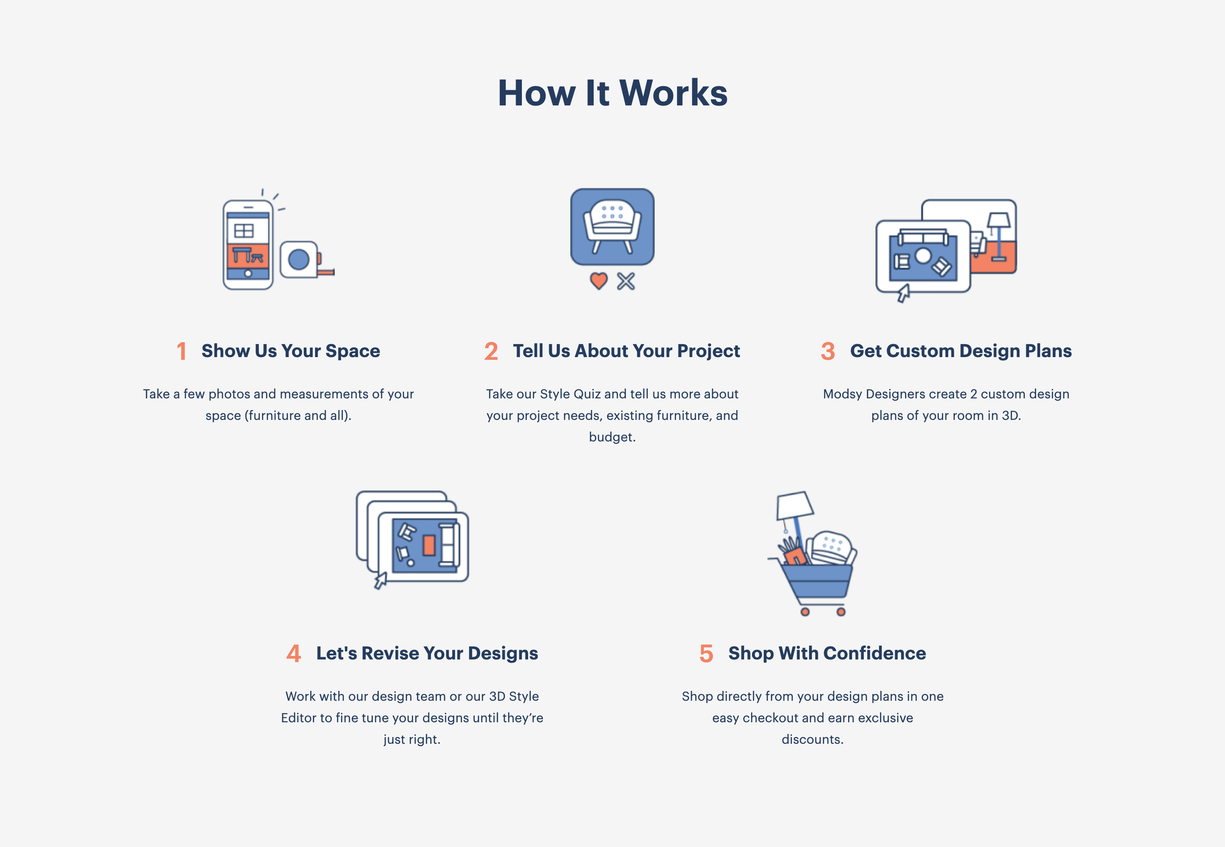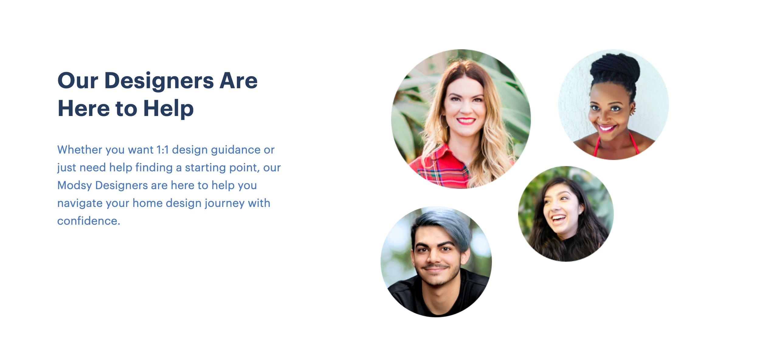 Solution: Along with considered language sprinkled throughout the homepage, we added a final module specifically spotlighting our designers. This helped clarify that Modsy was a service, not a tool, and the happy smiling faces gave prospective customers a boost of confidence that a real human was waiting to help them bring their dream room to life.