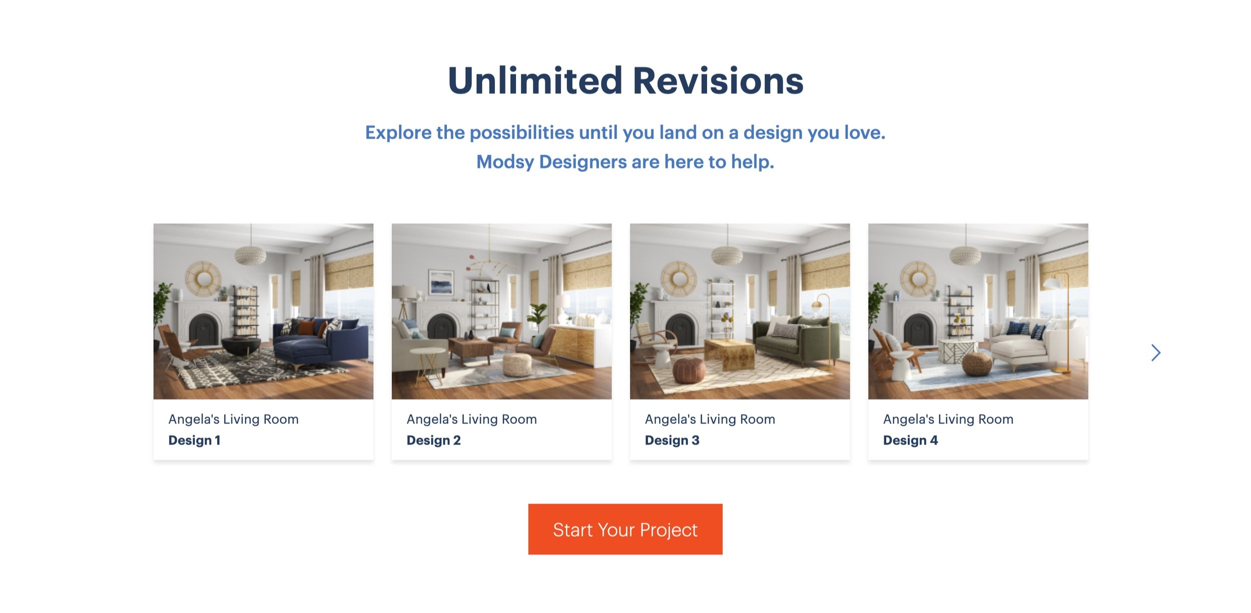 Solution: We implemented an ‘Unlimited Revisions’ policy, letting customers know we’d work with them on their designs until they were satisfied. Including the visual of fictional customer Angela’s various living room designs, further clarified this message and helped customers feel more confident in our service.