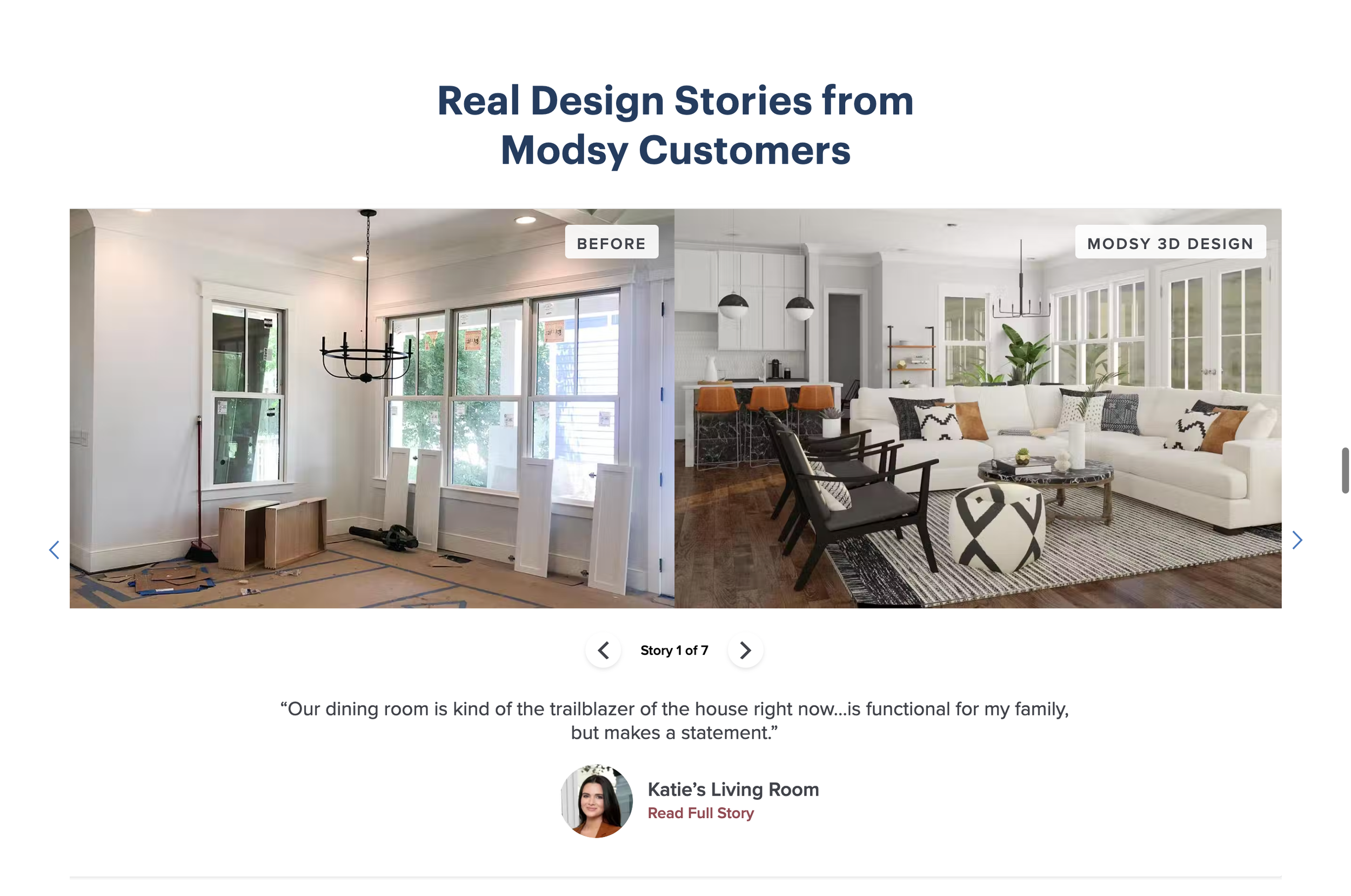 Showing examples of projects from real Modsy customers was a huge piece of the puzzle in terms of driving conversion. We integrated a robust module showing a healthy number of matching before photos with 3D Modsy designs along with the client’s headshot and a quote about their experience. Each story linked out to a long-form blog post that chronicled the customer’s journey, starting with their initial design struggle and ending with their solution.